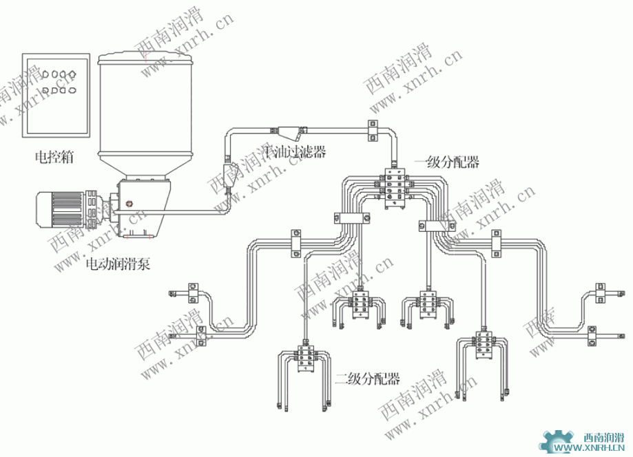 電動單線集中供油系統由全自動電控柜、電動潤滑泵、過濾器、監視器、一級(母)遞進式分配器、二級(子)遞進式分配器、根據需要可以接三級(孫)遞進式分配器(最多可接三級)、管路等組成。此系統優點體現在全程自動:工作時間、間隙時間、故障顯示、管道壓力等,由電控柜按設定的程序驅動。該系統的改進優點是根據遞進式分配器的選型不同,在管路或分配器上配有監測溢流閥和指示器。可以自動和直觀的檢察系統運行狀況,一旦系統堵塞,報警器就會發出報警信號。