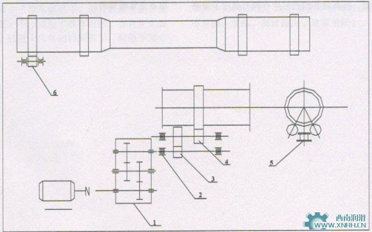 1.齒箱;2.傳動軸承;3.傳動齒輪;4.開始齒輪;5.擋輪瓦;6.托輪瓦