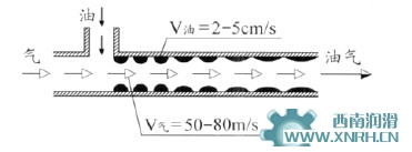 由于生產設備實現了流水作業,多臺機器有機地聯系在一起,形成一個整體——生產線。整條生產線上,潤滑點很多,各潤滑點對油品的要求也不盡相同。可喜的是,潤滑油品實現了高性能化、低粘化、通用化,使供油方式得以實現多點集中潤滑。近些年,供油方式發展了油氣潤滑和噴射潤滑。油氣潤滑的原理,如圖1 所示。在油氣潤滑系統中,定時、定量間斷地供給潤滑油品,用壓縮空氣,沿油管內壁將油吹向潤滑點,將油品準確地供應到最需要的潤滑部位。