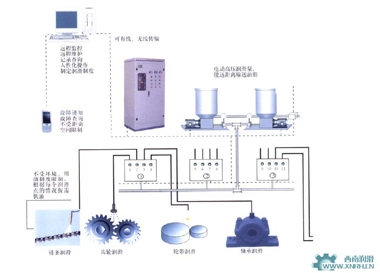 由于油泵輸出的油品,一直在管路中運行,在油品輸送過程中,油品不與環境介質接觸,保證了油品的清潔度和高性能,使用這種潤滑方式避免了環境干擾,更適用于高速、重載、高溫工況,以及易受贓物、水和化學性流體侵蝕的場合。由于采用程序控制或智能控制,一個供油系統,可以供幾十個甚至上百個潤滑點,并可保證對每個潤滑點按時供給必要量的油品。