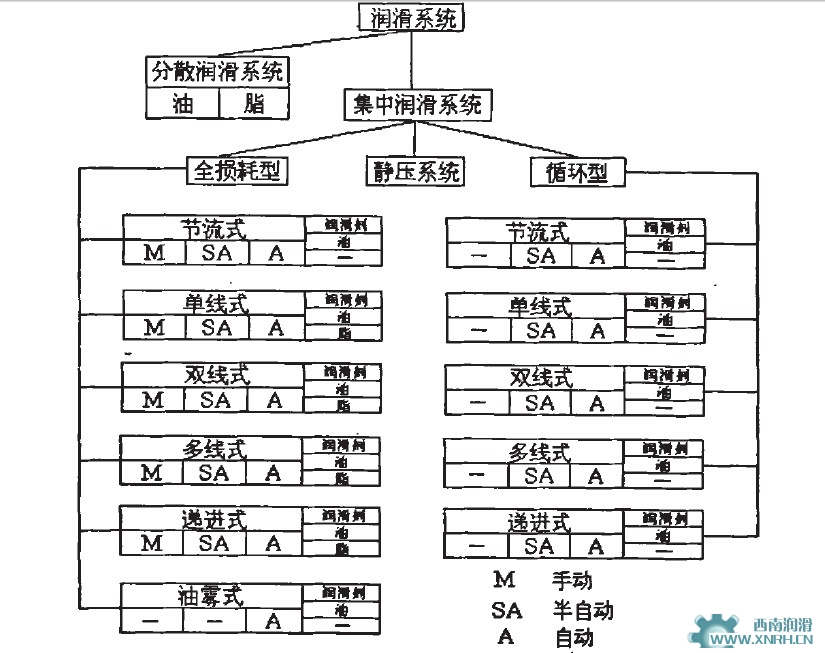 潤滑系統是向機械設備的摩擦點輸送潤滑劑的系統,它包括用以輸送、分配、調節、冷卻、凈化以及其壓力、流量和溫度等參數和故障的指示、報警和監控的整套裝置。機械設備使用的潤滑系統主要為分散潤滑系統和集中潤滑系統兩大類,具體如圖2-4所示: